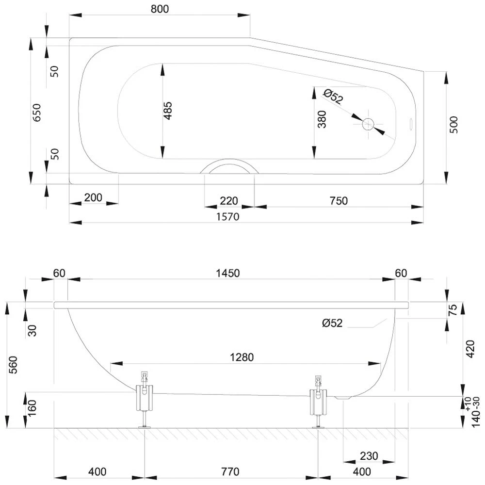 - Maße: 157,0 x 65,0 x 42,0 cm für ca. 104 Liter Wasser bei einem Badenden.