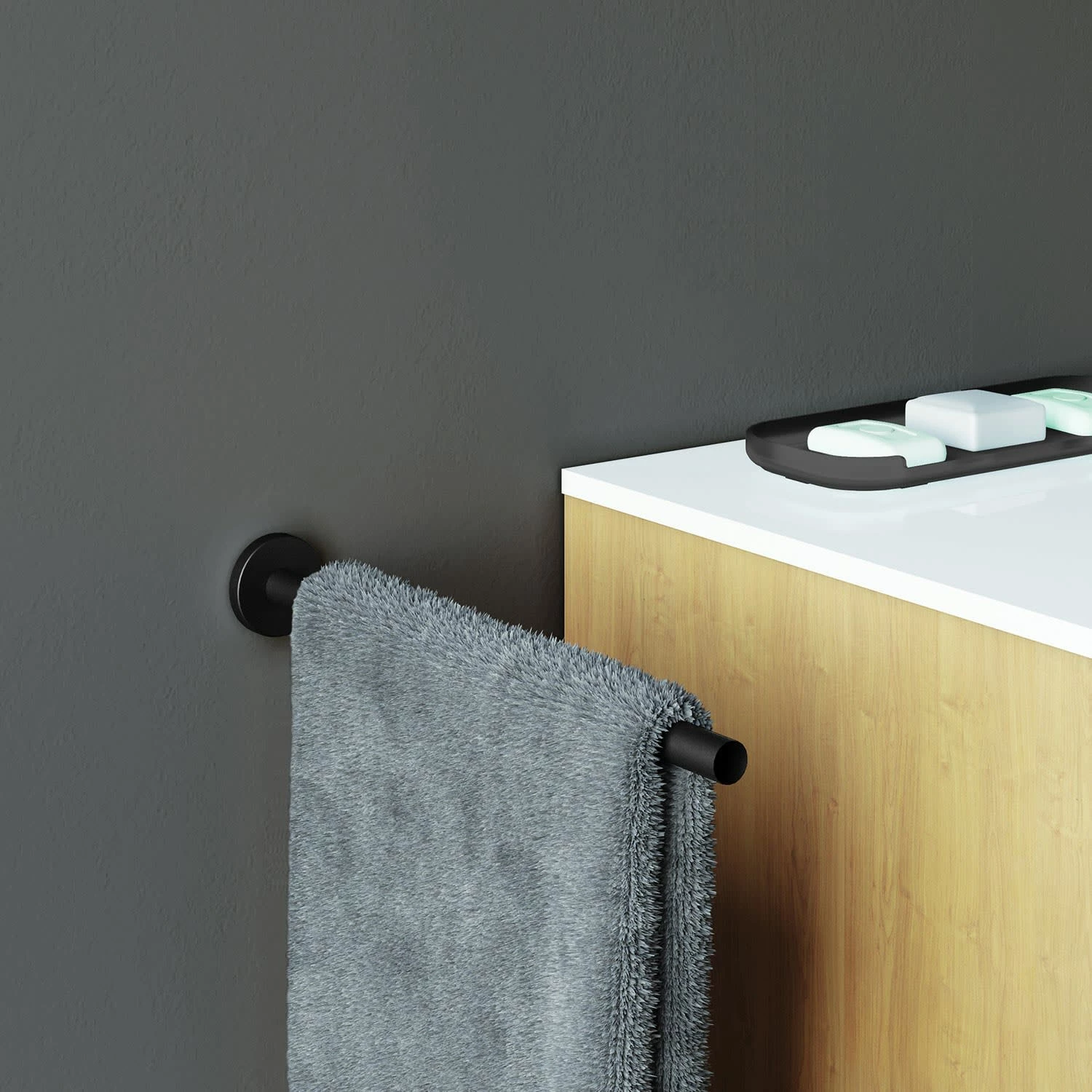 Wenn Sie einen Handtuchhalter haben möchten, aber nicht genug Platz haben, um ihn an der Wand anzubringen, ist die Lösung ein senkrechter Handtuchhalter wie dieser. Sein Finish ist ein Soft Black, ein extra mattes Schwarz, das es sehr widerstandsfähig, kompakt und gleichmäßig macht. Darüber hinaus ist er nach der Installation vollständig an der Wand befestigt, da es über ein von Cosmic entwickeltes, extrem widerstandsfähiges Befestigungssystem verfügt, das die vollständige Befestigung garantiert. Dieser Handtuchhalter gehört zu der Kollektion Architect S+, die von Cosmic Studio mit dem Ziel entworfen wurde, eine Kollektion mit maximaler Funktionalität anzubieten. Cosmic ist eine Marke, die sich auf Designer-Bad-Accessoires und -Möbel spezialisiert hat. Sie zeichnet sich durch Innovation und die Verwendung neuer Materialien aus und ist bestrebt, das Wohlbefinden der Badbenutzer zu fördern. Der Handtuchhalter ist aus Messing oder ähnlichen Legierungen hergestellt. Das Produkt hat eine Garantie von 10 Jahren. Zur Reinigung Seifenwasser verwenden, mit viel Wasser abspülen und anschließend mit einem weichen Tuch oder Fensterleder abtrocknen. Verwenden Sie niemals starke säurehaltige Produkte, Bleichmittel oder Scheuermittel.