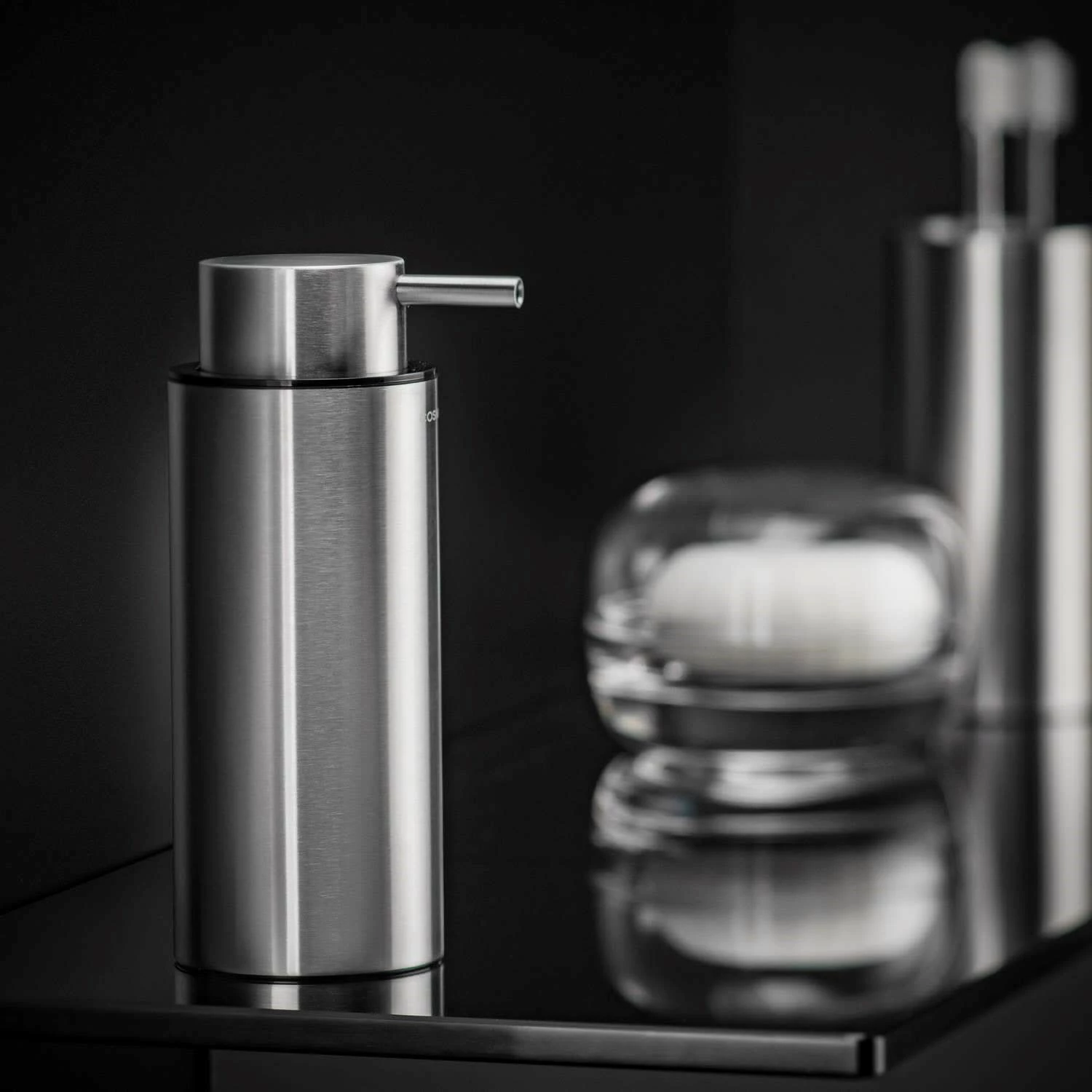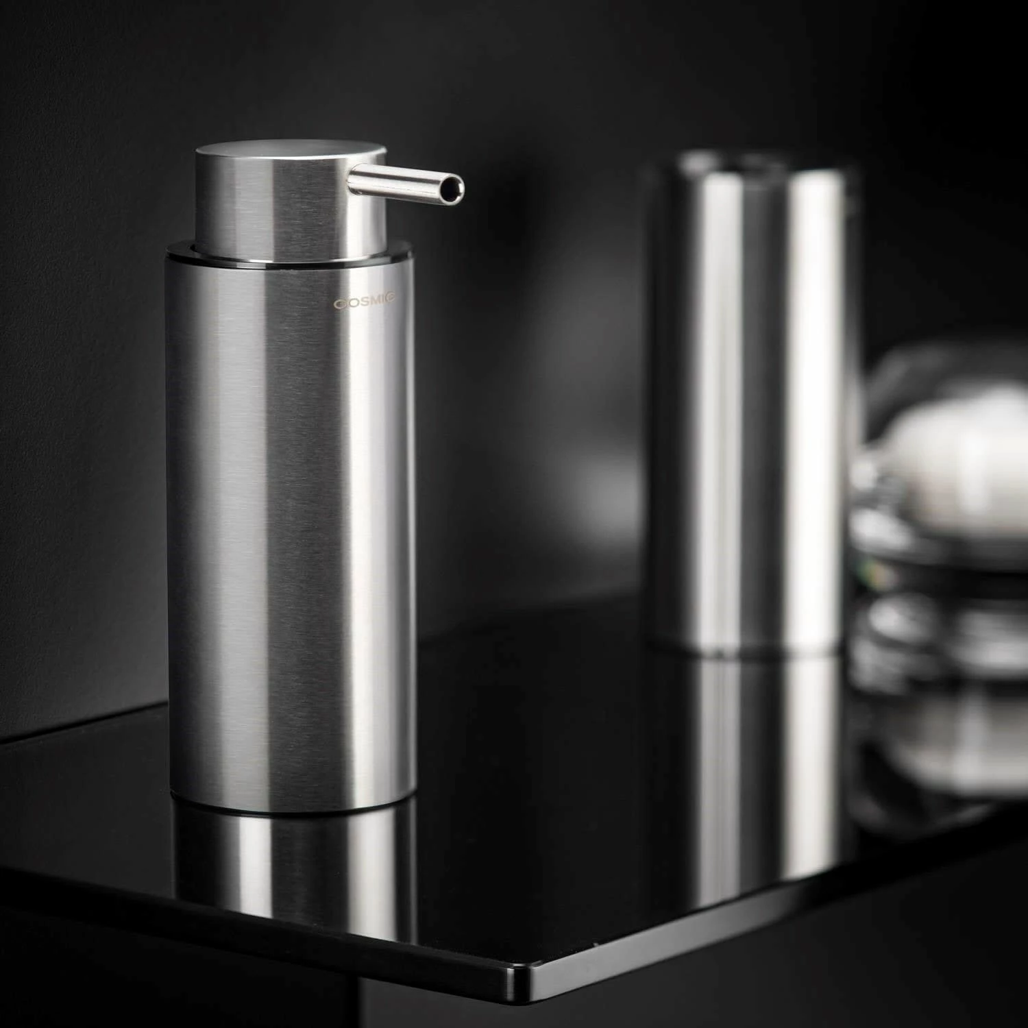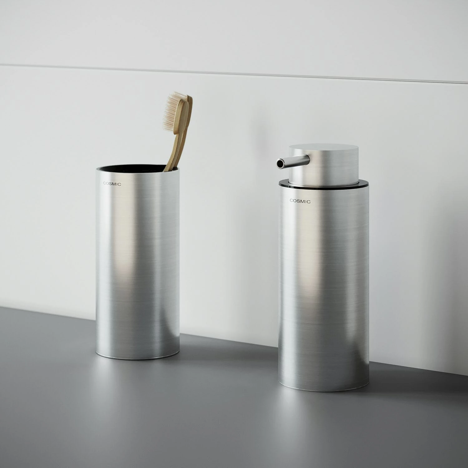 Der Seifenspender ist Teil der Logic-Kollektion von Cosmic. Der von Cosmic Studio entworfene Vorschlag ist eine vollständige Sammlung von Badzubehör, das Grundformen für eine komfortable Badumgebung enthält.
