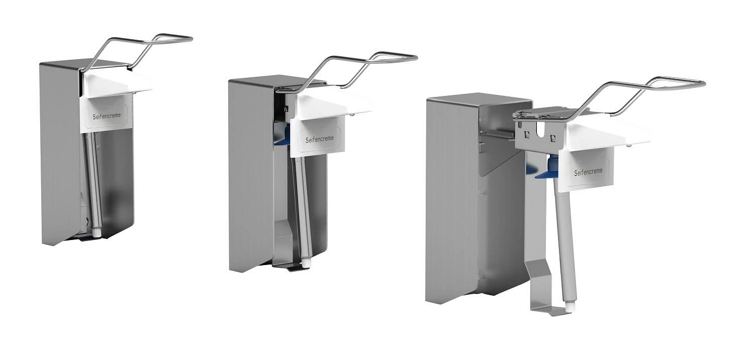 - geeignet für enge Platzverhältnisse unterhalb des Spenders: mit dem Hebel kann die die Pumpeneinheit nach vorn aus dem Gehäuse herausgezogen werden