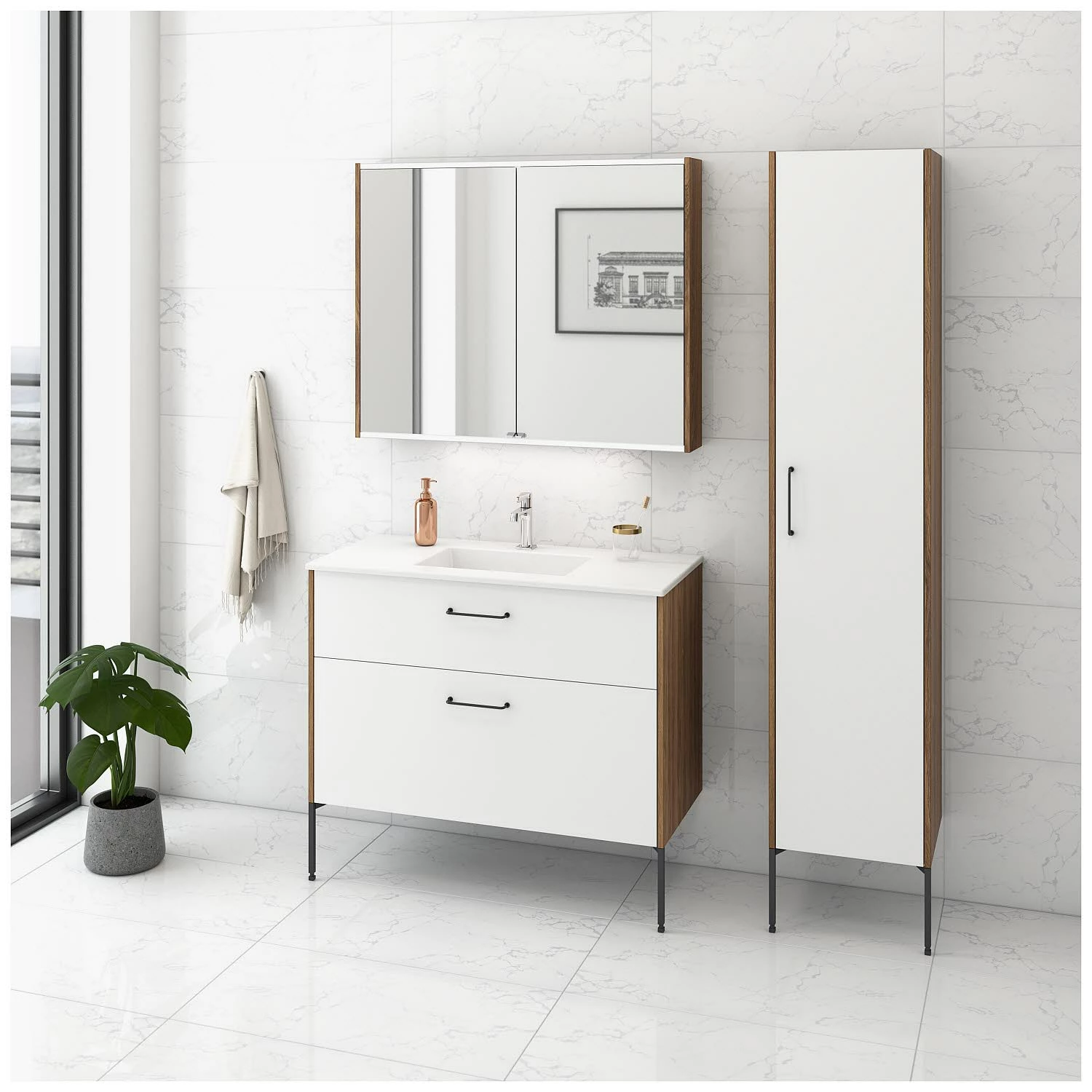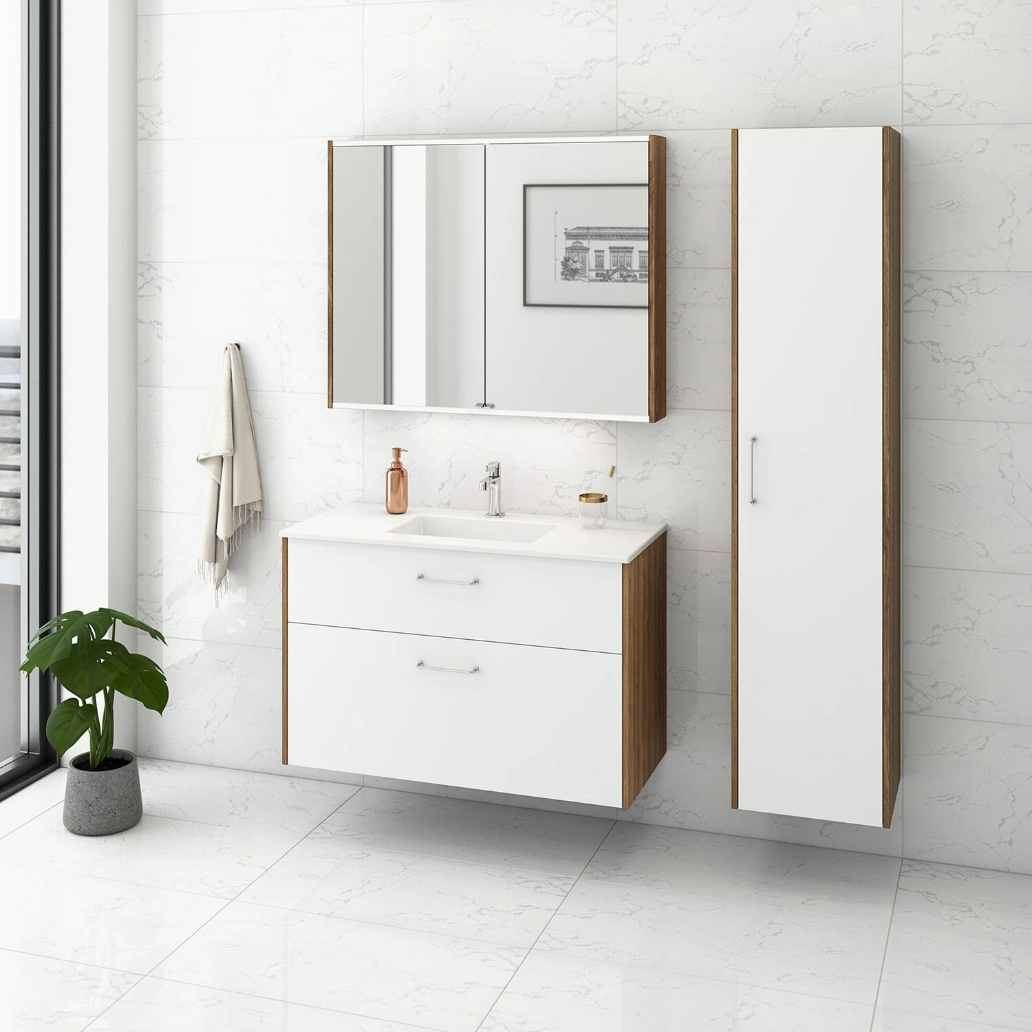 Die Beschreibung der Frontfarbe bezieht sich auf den Waschtischunterschrank und die Korpusfarbe auf den Waschtischunterschrank sowie Teile des Spiegelschrankes. Dabei ist „weiß matt“ immer in lackierter Ausführung.