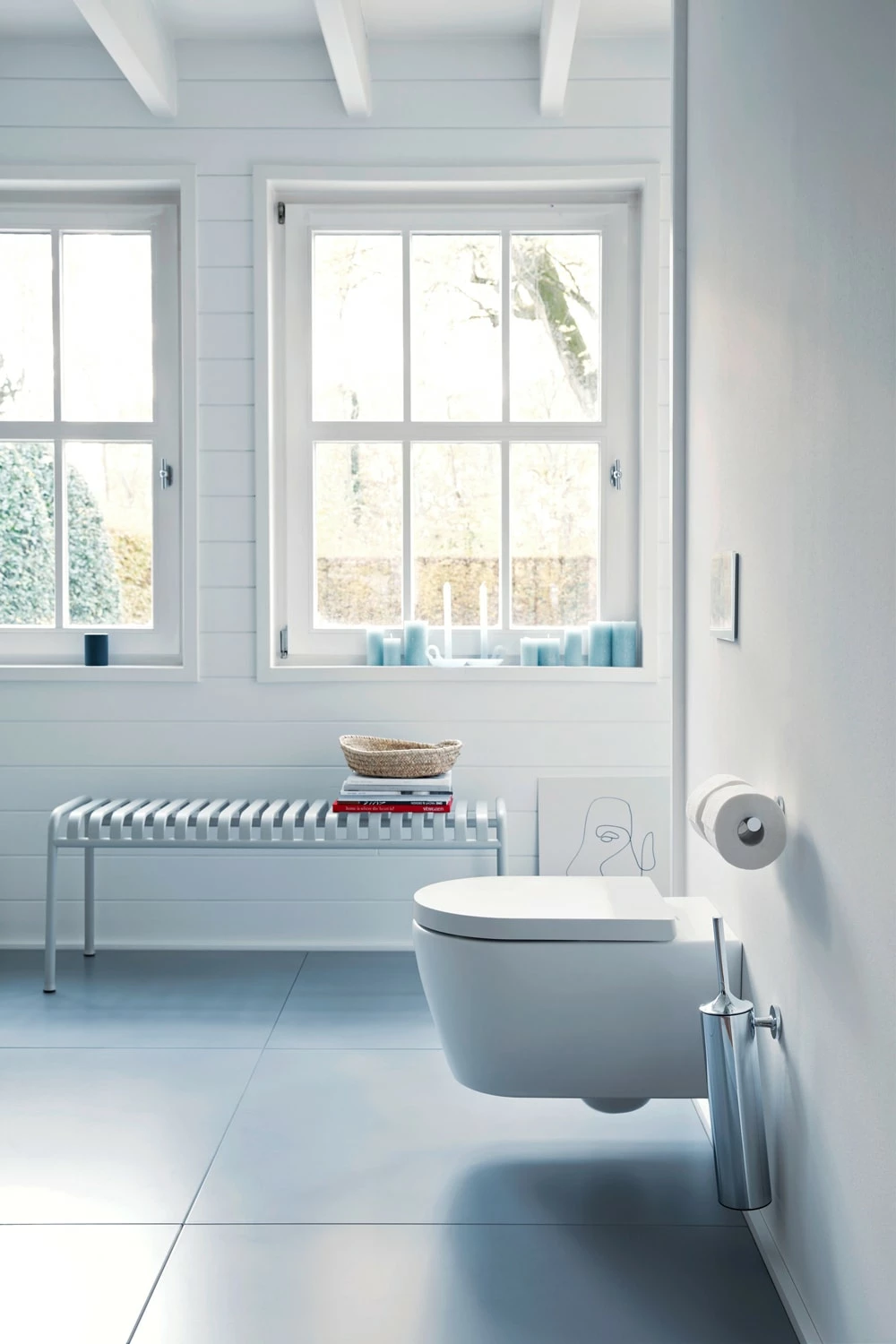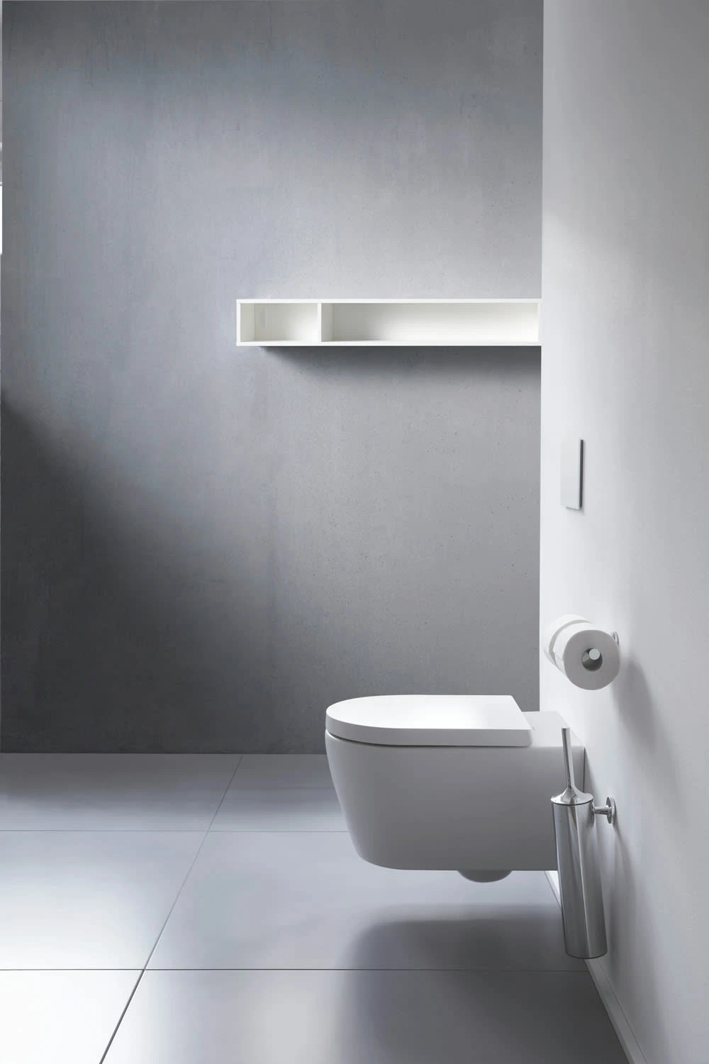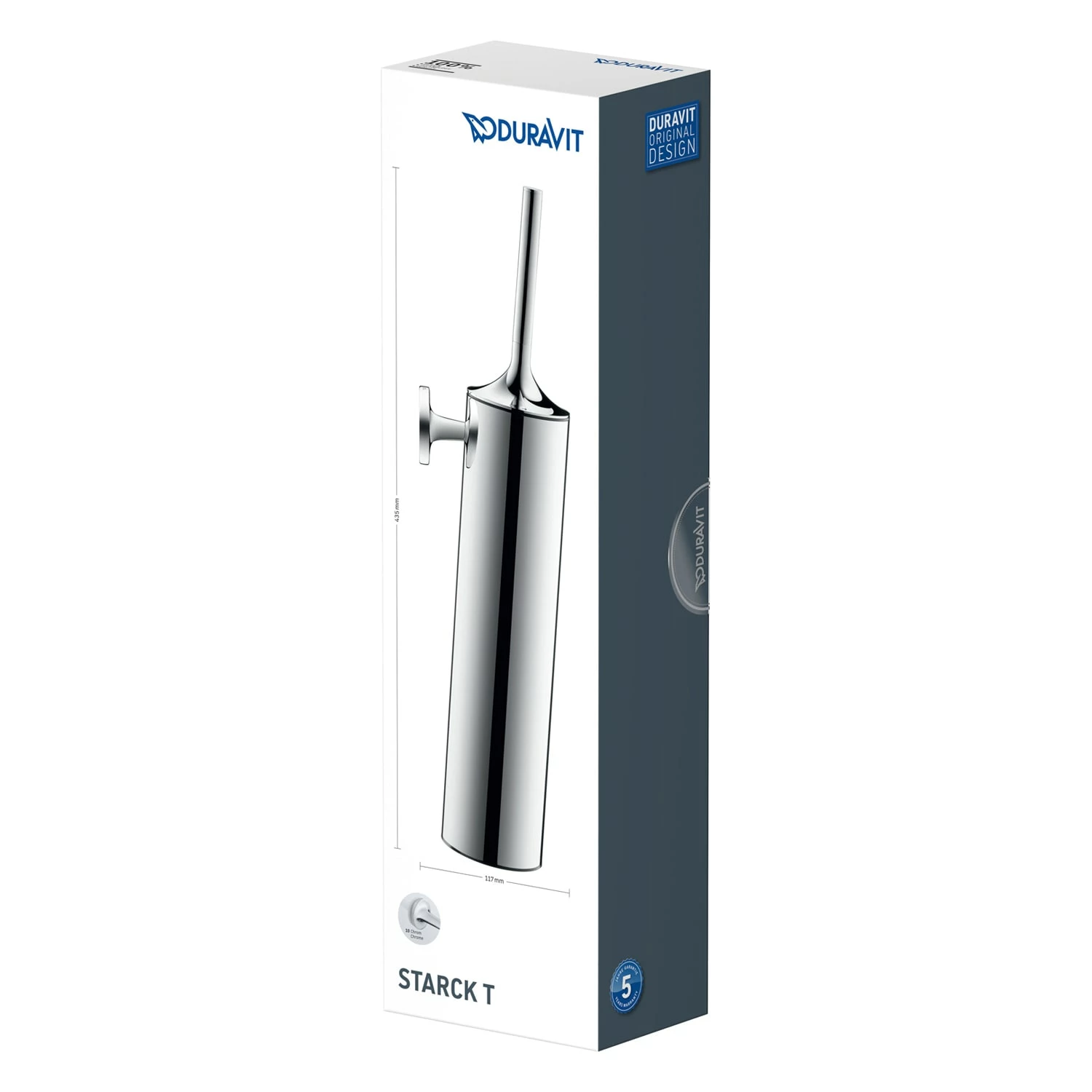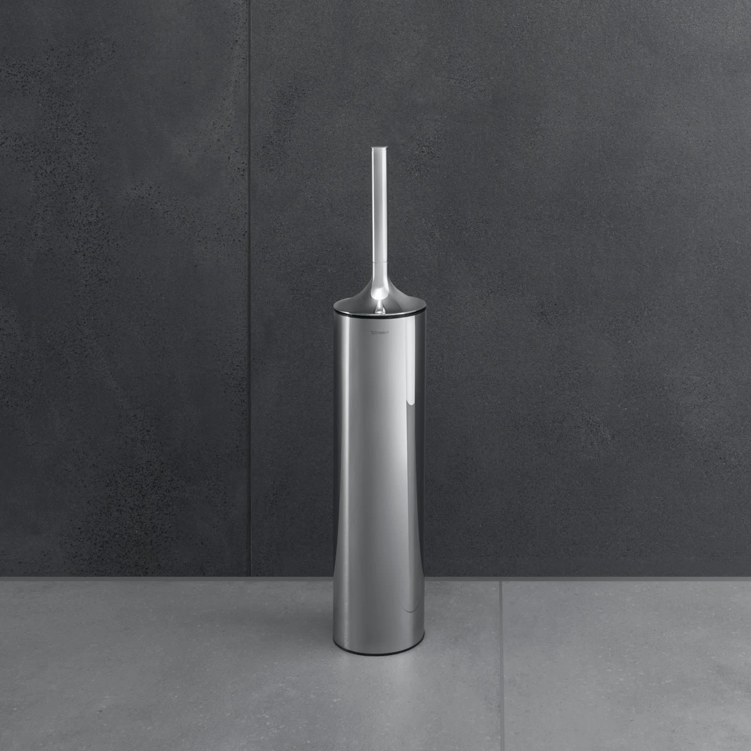 Form und Funktion vereinen sich auf ikonische Weise in der Duravit Starck T Bürstengarnitur: ein exklusives Bad-Accessoire aus der Feder des Star-Designers Philippe Starck, dessen Bürste mit stilvollem Metallgriff von einem wohlproportionierten, zylindrischen Metallbehältnis aufgenommen wird. Die Garnitur wird mittels eines verdeckten Befestigungssystems elegant und platzsparend an der Wand montiert. Dabei kann die WC-Bürstengarnitur sowohl an die Wand geschraubt als auch geklebt werden. Alternativ steht auch eine bodenstehende Variante zur Verfügung, bei der die Wandmontage komplett entfällt. Die serientypische Designidee eines verästelten Baumes findet sich im weich geformten Griffansatz der Bürste sowie dem sanft geschwungenen Übergang zur rund gestalteten Bürstenhalterung wieder. Nachhaltiges Extra der hochwertigen Ausführung: der Bürstenkopf ist abnehmbar und kann bei Bedarf ausgetauscht werden.