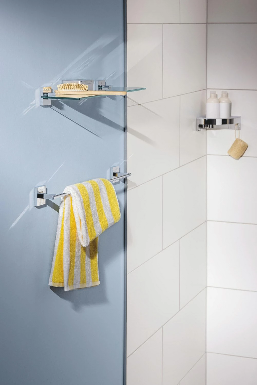 Der GROHE Start Cube Badetuchhalter ist aus den edelsten Materialien gefertigt und passt perfekt in jedes moderne Bad. Durch die verdeckte Befestigung und die schöne Oberfläche wirkt er überaus hochwertig. Dank der langlebigen und einfach zu reinigenden GROHE Long-Life Shine Beschichtung strahlt er viele Jahre lang. Er kann entweder mit den mitgelieferten Schrauben und Dübeln an der Wand angeschraubt oder ganz einfach angeklebt werden. Alles, was Sie brauchen, ist der GROHE QuickGlue (zwei Tuben für zwei Montageplatten, separat erhältlich). In unserem QuickGuide und dem QuickVideo zeigen wir Ihnen, wie einfach die Montage geht. GROHE Start Cube – in kürzester Zeit zu noch mehr Stil und Komfort im Bad.