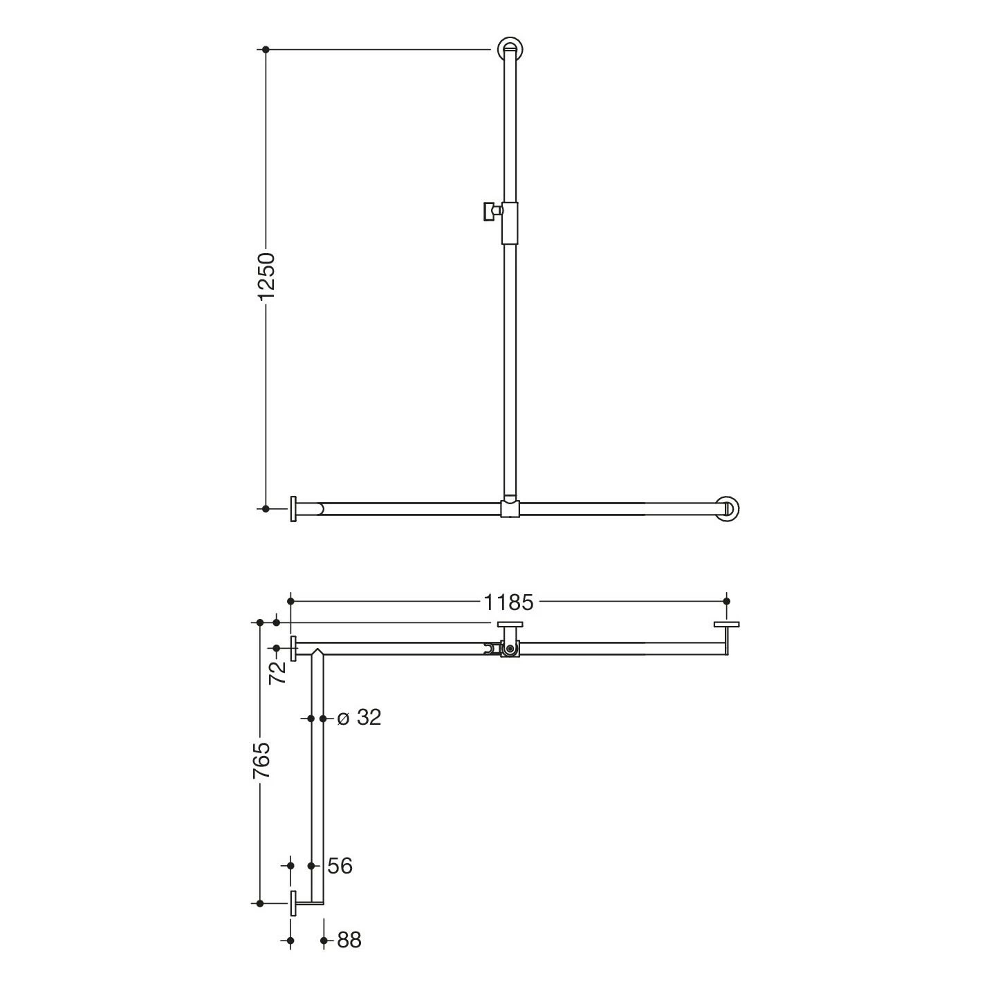 - senkrecht und waagerecht angeordnete, im rechten Winkel verbundene Stangen mit Befestigungsrosetten und magnetischem Brausehalter