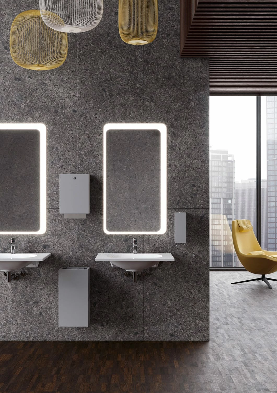 - automatische Papier-Ausgabe am Waschtisch nach dem Abreißen des Papiers