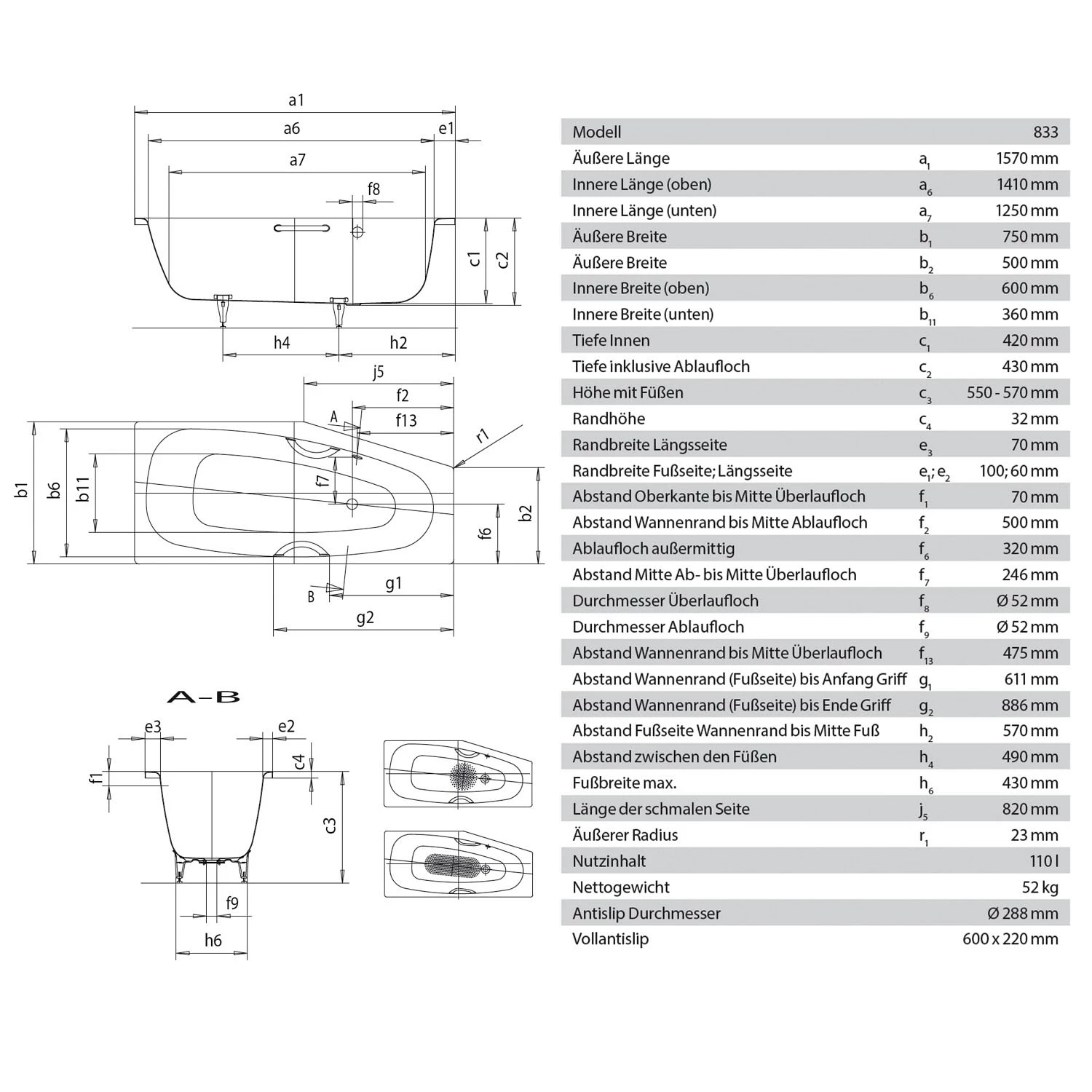 - einsitzige Wanne mit seitlich positionierten Überlauf