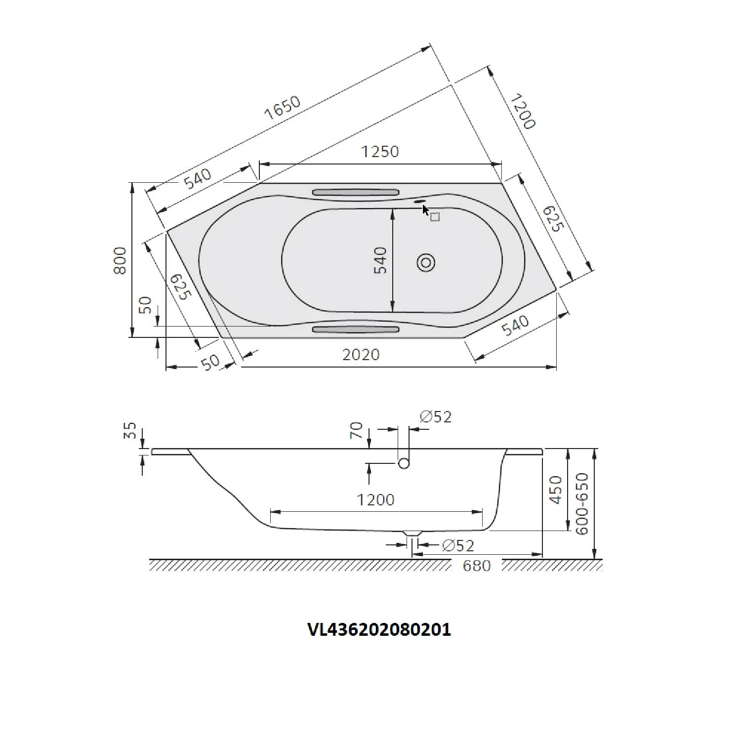 Koralle T200 6-Eckbadewanne 205 R, Überlauf hinten