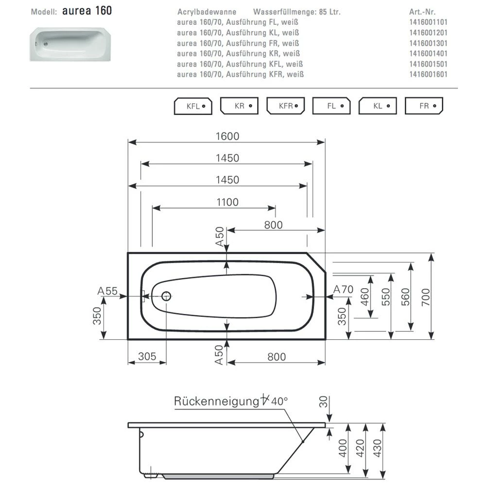 Mauersberger Raumsparbadewanne Aurea 160 Abgeschrägte Ecke Kopf-und Fußende links