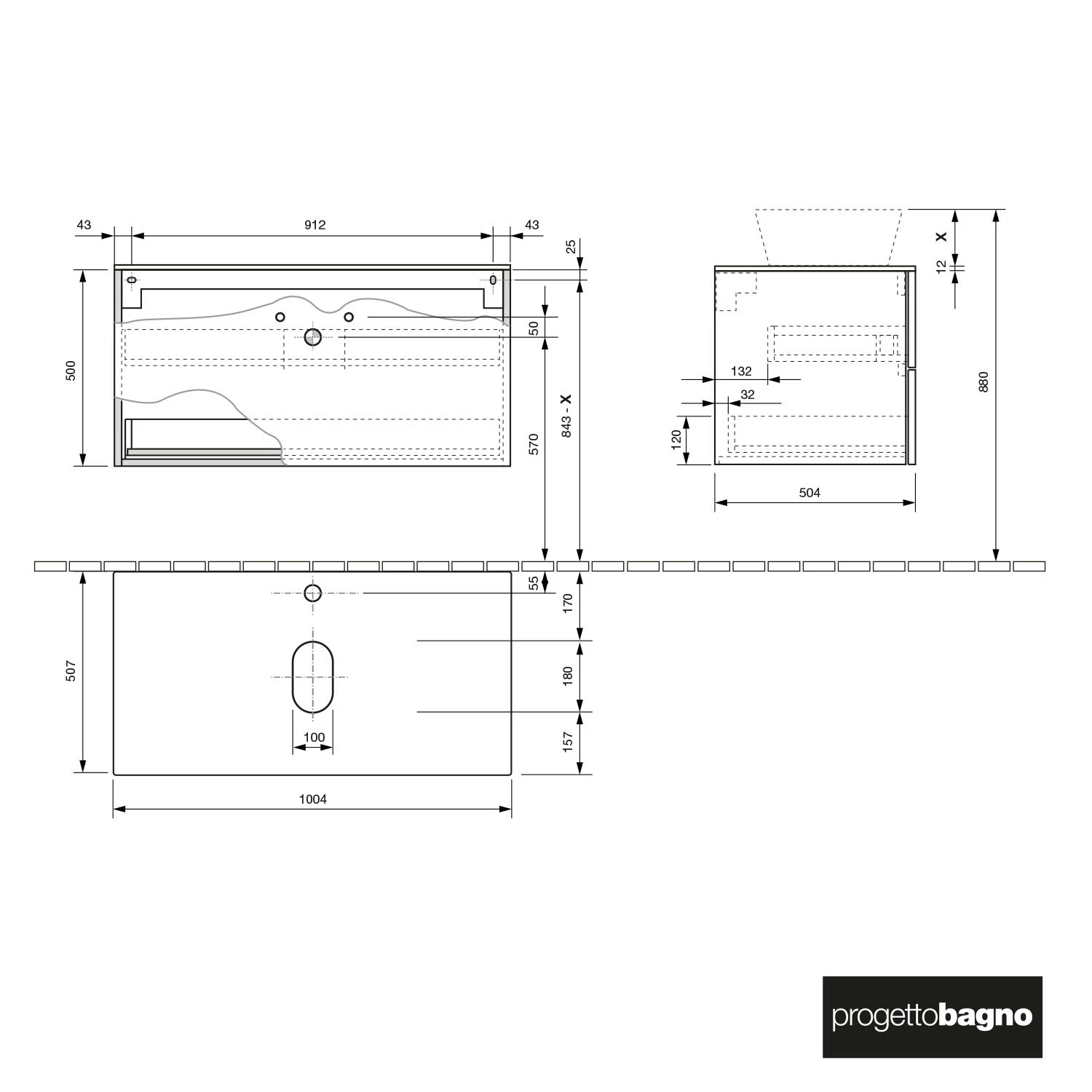 progettobagno Elba Modular Glass Waschtischkonsole 100 cm mit Hahnlochbohrung