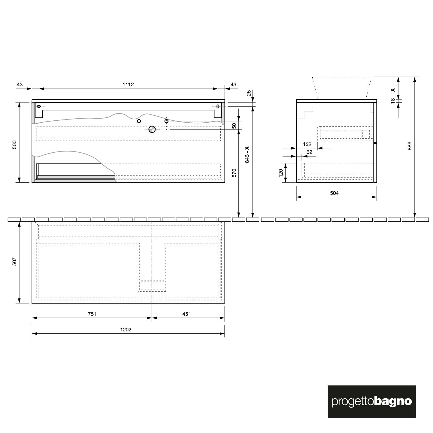 progettobagno Elba Modular Waschtischkonsole 120 cm, Ausführung rechts