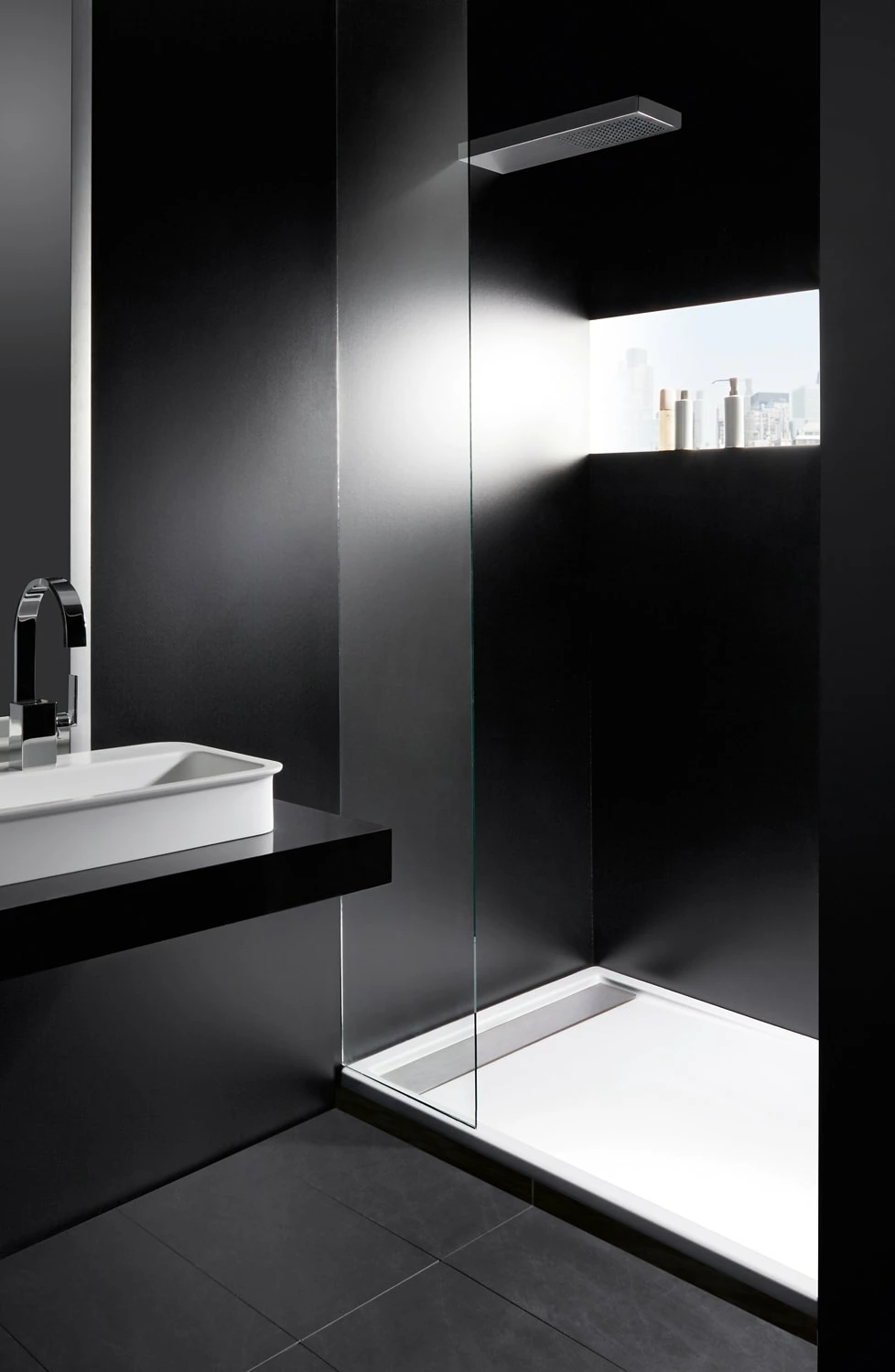 - superflaches modernes Design mit Rinnen-Ablauf in Edelstahl gebürstet