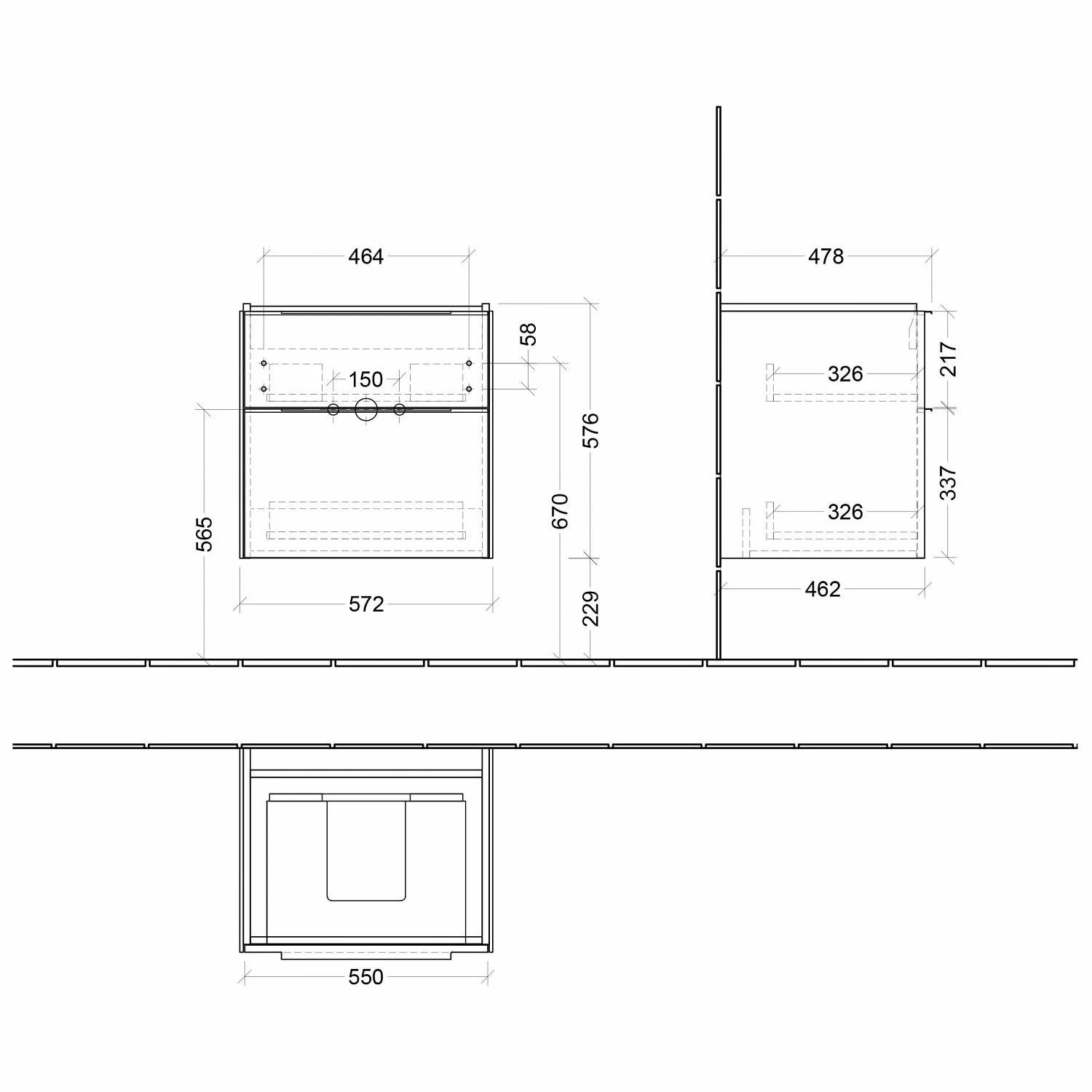 - 2 Auszüge als voll ausziehbare Schubladen mit Selbsteinzug-Funktion und rutschhemmenden Böden